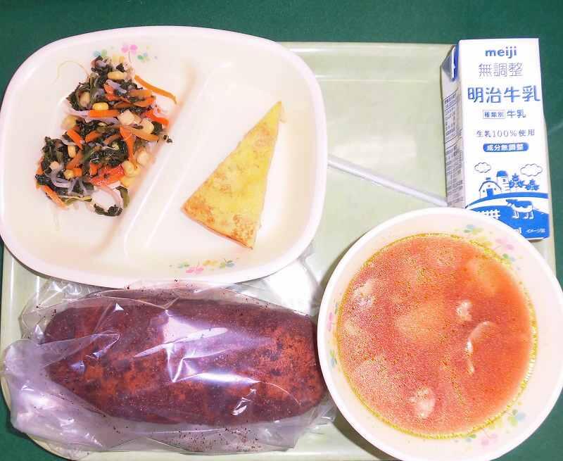 今日は、1年生から3年生は、ココア揚げパンです。給食室で1個1個揚げてから、特製ココアをまぶしました。揚げパンを袋に入れて、上手に食べましょう。
