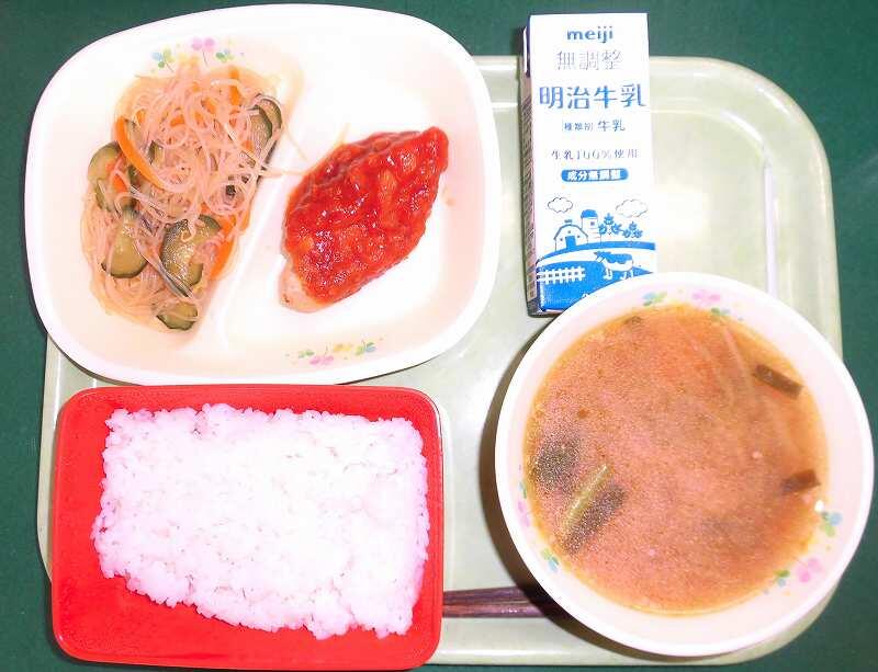 給食で使っているはるさめは「緑豆でんぷん」から作られ、つるりとした食感が特徴です。今日は、はるさめサラダです。こしのある、つるりとした食感を味わってください。