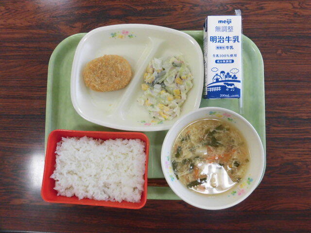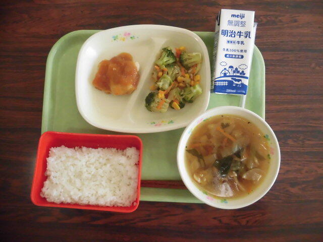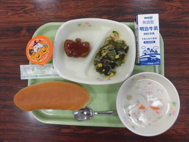今日は、ソースをかけたかぼちゃ型のハンバーグ、ハロウインデザートで、ハロウイン献立にしました。