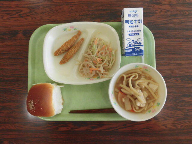 きびなごは、お刺身や天ぷら、ひものなどの料理に使われます。給食ではサクサクの衣を付けたフライにしました。