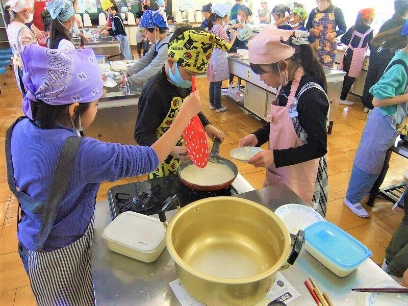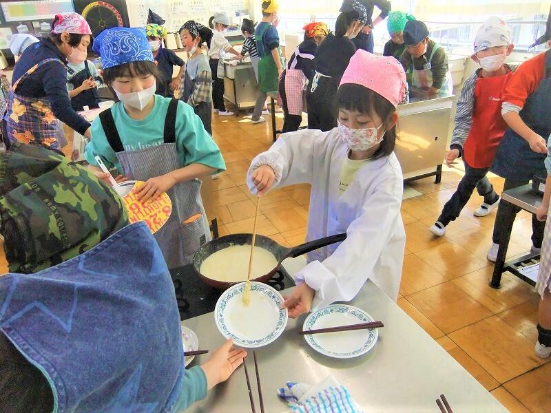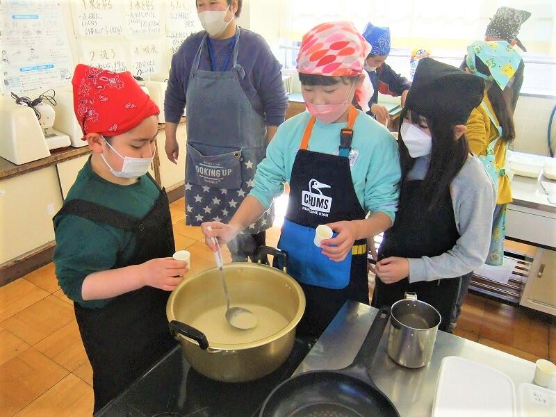 子どもたちは、総合的な学習の時間の活動で大豆について調べる過程で知ったことを生かしながら、友達と協力して豆腐づくりに取り組みました。湯葉も味見することができ、笑顔がたくさん見られました。作った豆腐は持ち帰りましたので、ご家族で召し上がってください。