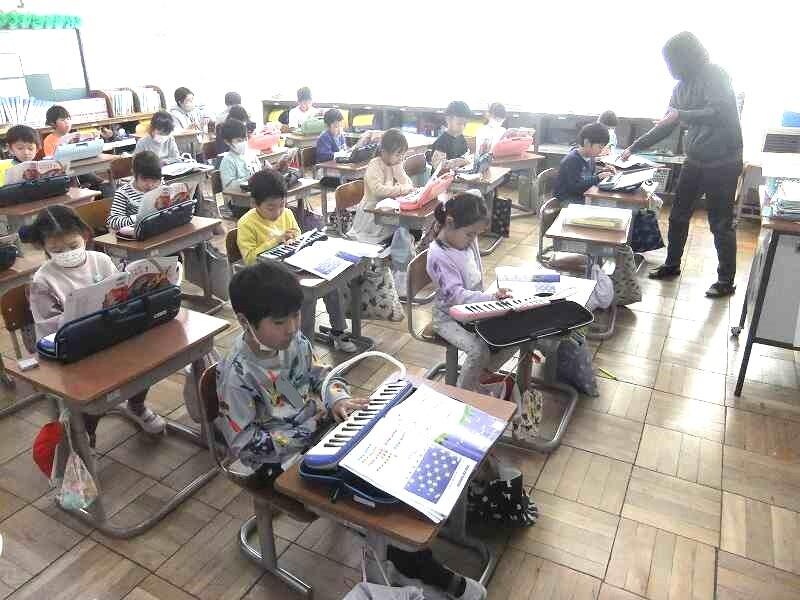 音楽の授業の様子です。「めざせ楽器名人」の学習で、鍵盤ハーモニカの演奏の練習をしています。演奏を楽しんだり、友達の弾く音楽を楽しんだりしながら、音楽に親しむことができました。