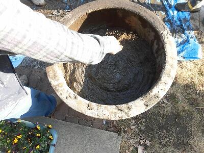 玄関脇に置いてあるハスの植え替え作業を行いました。
