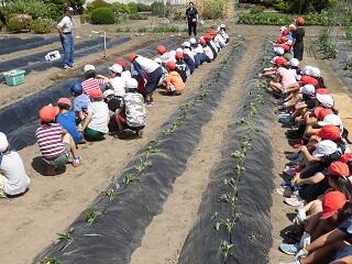 環境サポート隊の方々に教わりながら、5月16日(木)には、5年生がカボチャの苗を植えました。また、5月30日(木)に、6年生が大豆の種まきを行い、昨日と今日の2日間にわたり4年生がさつまいもの苗を植えました。