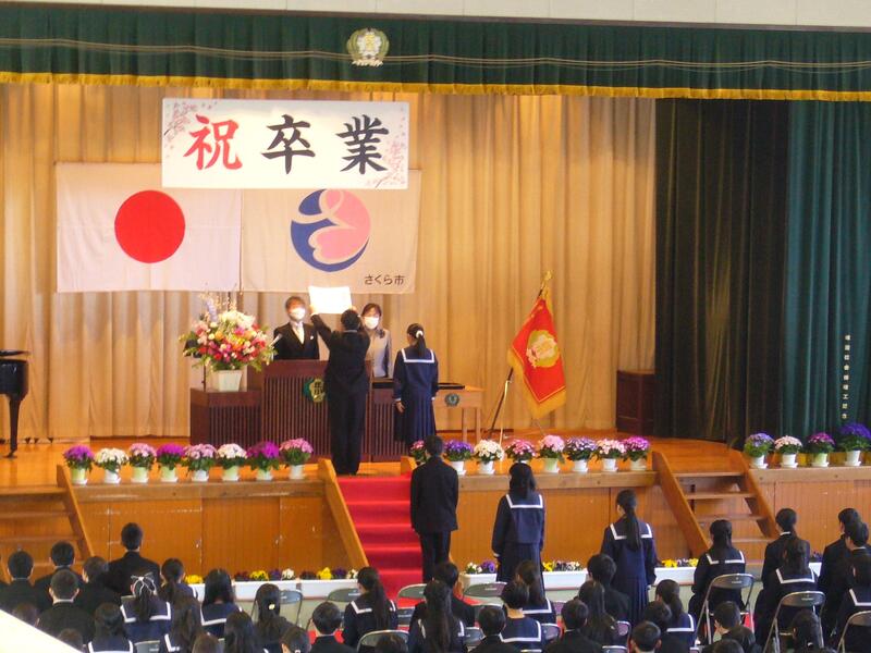「卒業証書授与」では、担任の呼名に応え、卒業生は感謝の気持ちを込めて全力で返事をしていました。