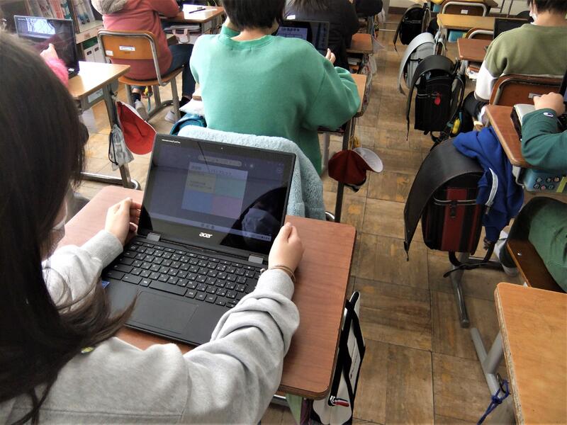 総合的な学習の時間です。将来就きたい職業について調べて、タブレットにまとめています。