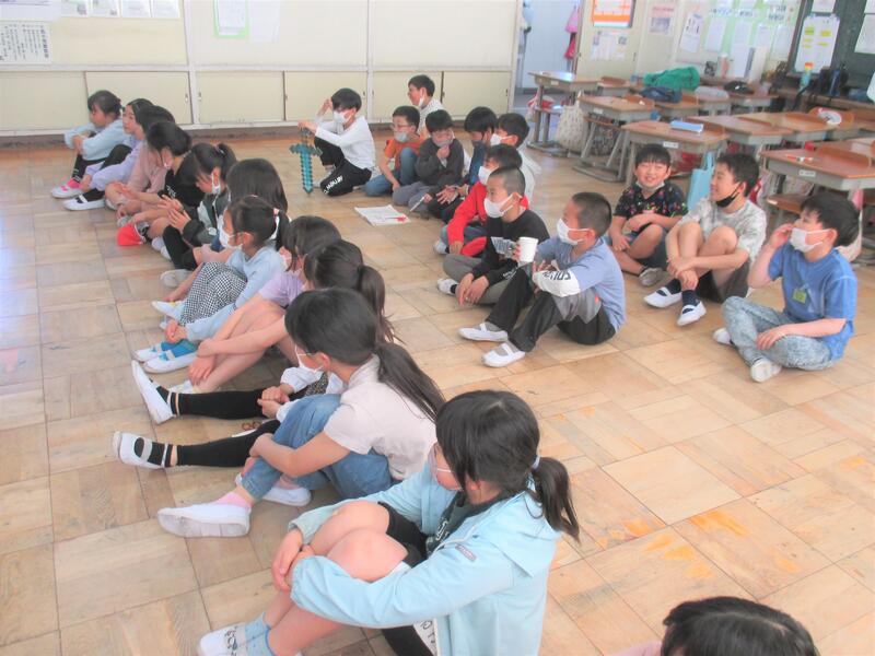 学級活動の集会活動の様子です。子どもたちが自主的に楽しい発表を考え、みんなでそれを見ています。