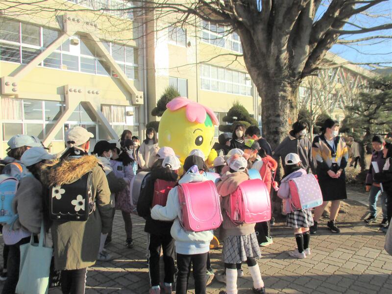 朝は、児童会企画委員と代表委員、そして150周年のお祝いに来てくれた「さくらッピー」との元気なあいさつ活動で始まりました。