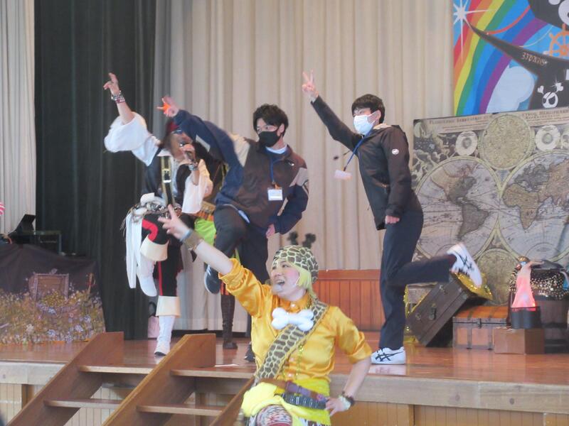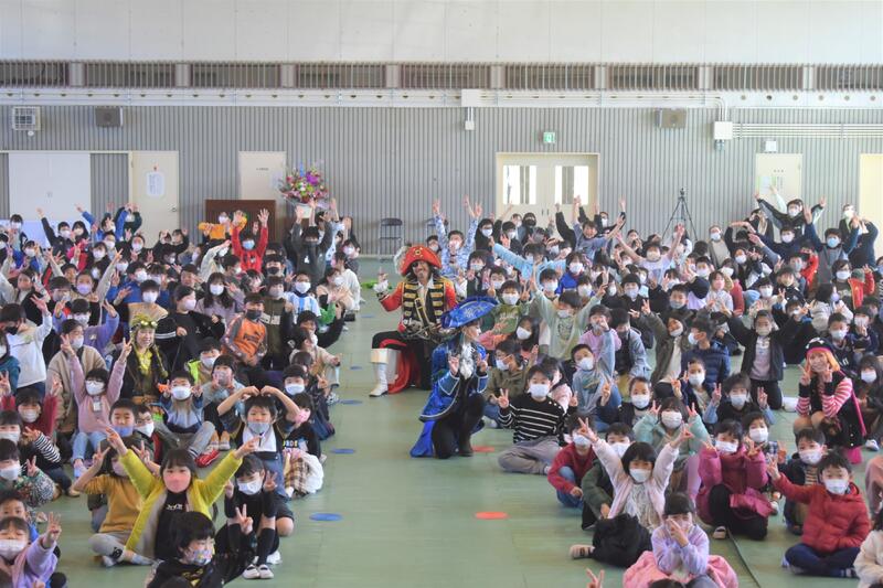 代表児童が、お礼の気持ちを込めて花束を贈呈しました。「歌う海賊団ッ!」の皆さん、ありがとうございました。