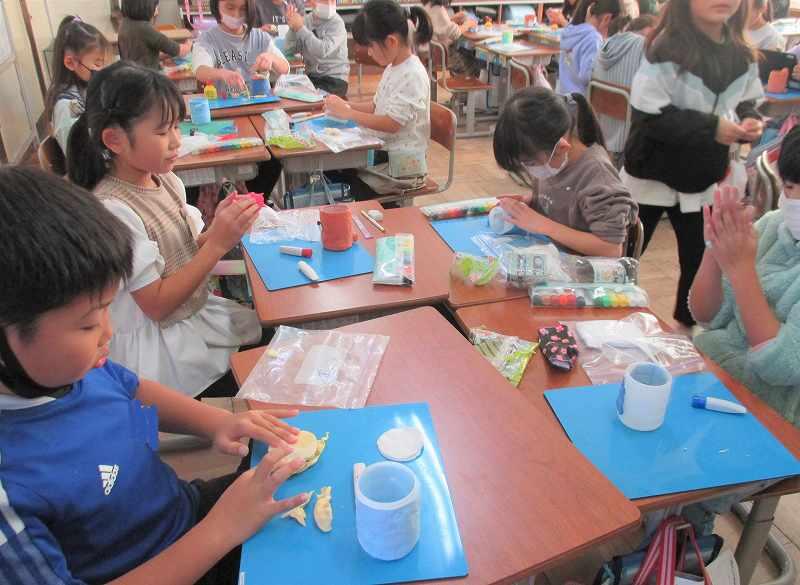 図工の「空き容器の変身」の学習の様子です。絵の具を混ぜた紙粘土を空き容器に貼り付けて、作品を作っています。作品が完成した児童は、写真を撮影してロイロノートに記録しました。