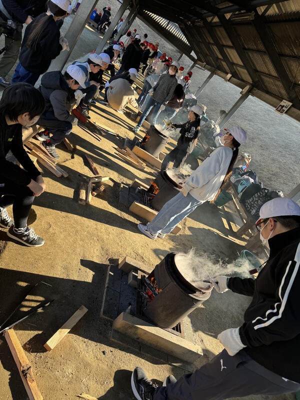 塩づくりです。グループで担当の児童が海辺に行き、教員が汲んだ海水を運びました。