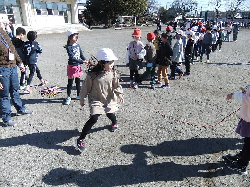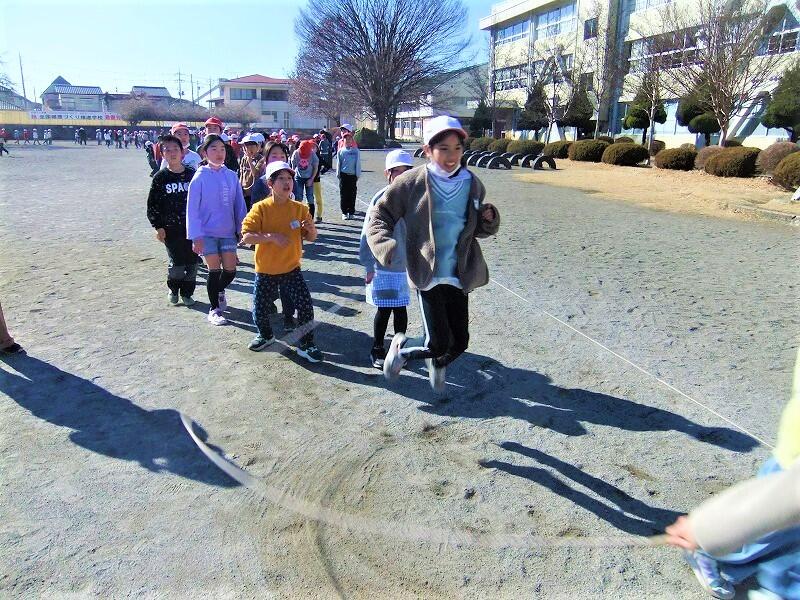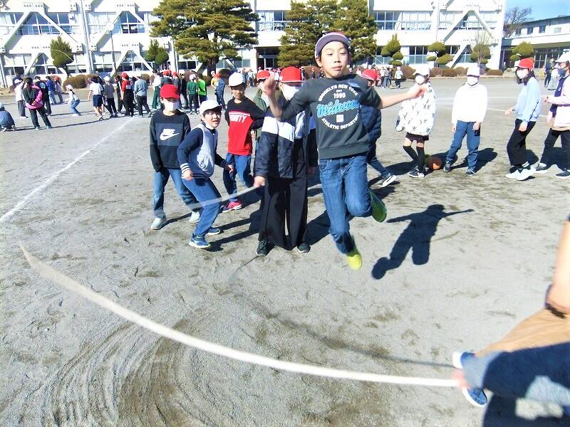 昼休みから練習しているクラスもあり、子どもたちはやる気いっぱいで、跳べた回数を数える元気な声が校庭に響いていました。