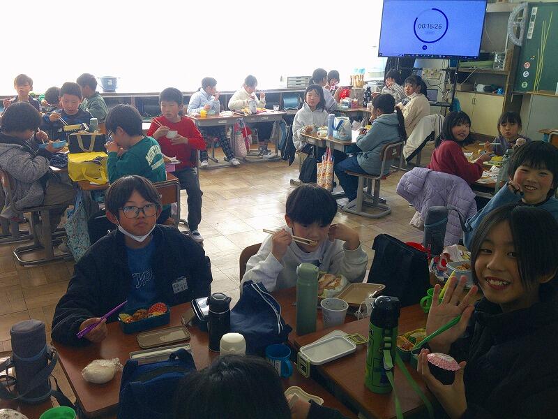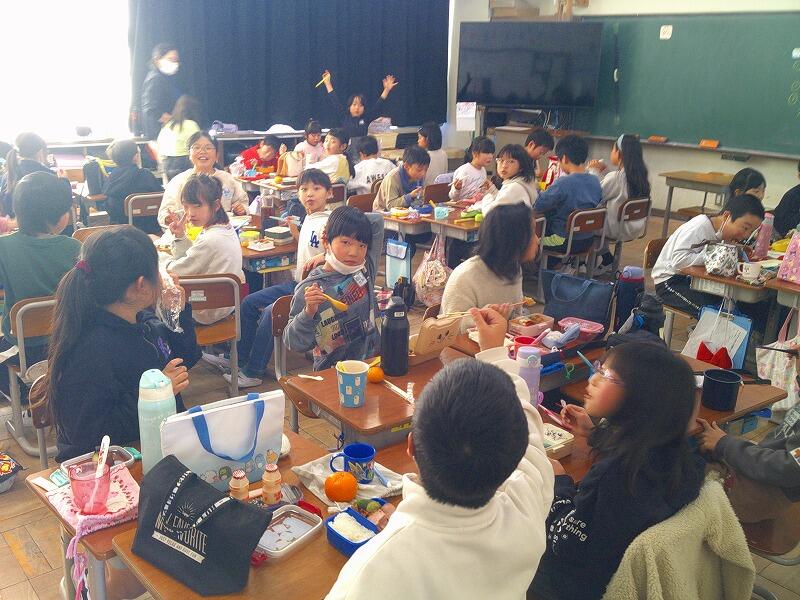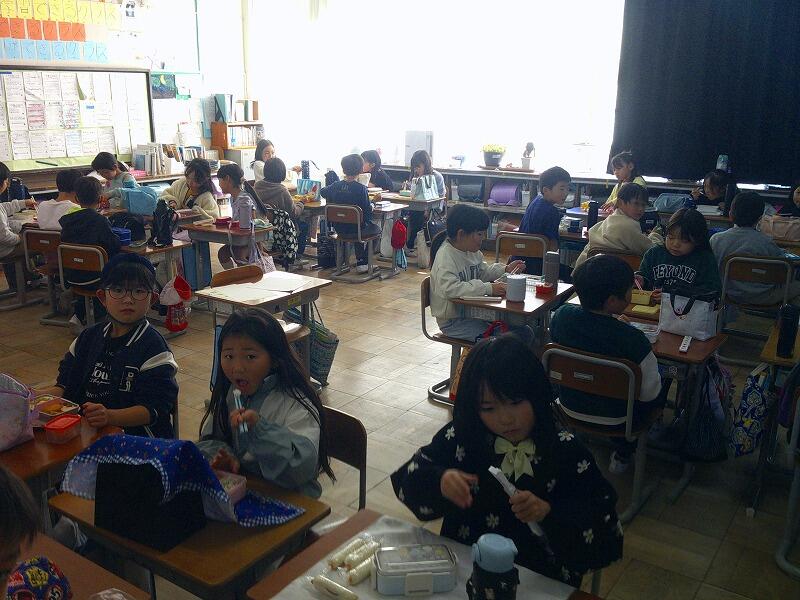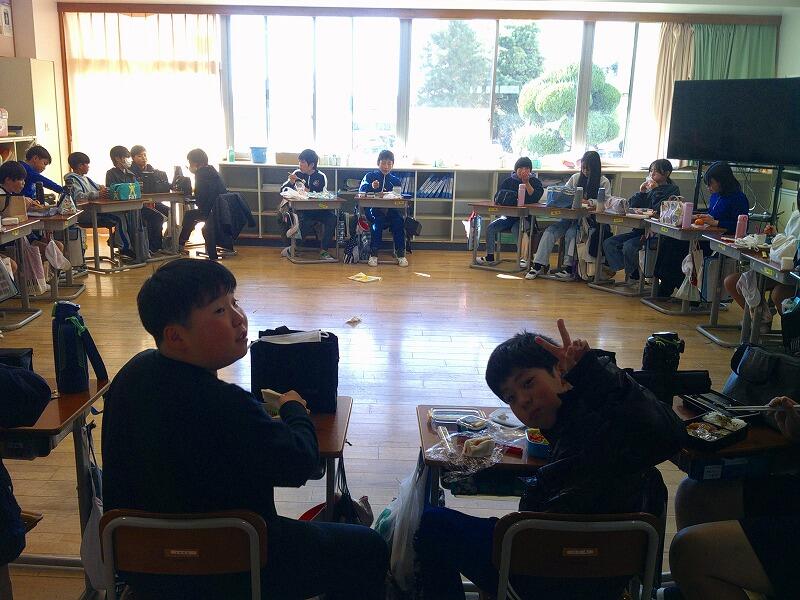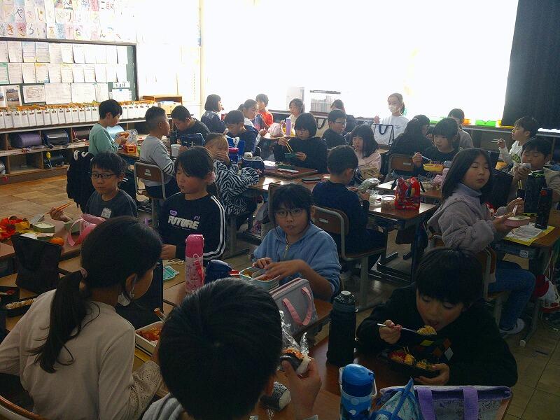 普段の給食は、授業中と同様、前を向いて食べていますが、今日は、クラスごとに、グループを作ったり、ペアになったり、大きな輪になって食べたり、色々な形態で楽しく食べていました。