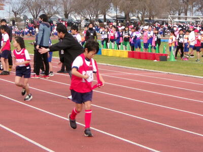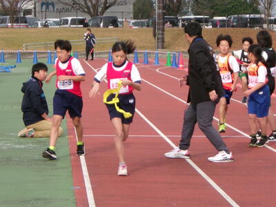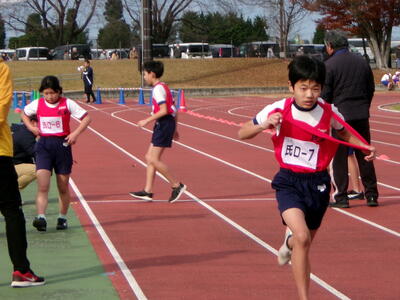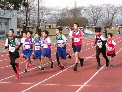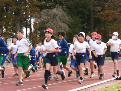 温かい冬晴れの本日、5・6年生の希望者が、駅伝の部とエンジョイランニングの部にそれぞれ参加しました。市内6校の児童が、各校で養った持久走の力を試し、競い合いました。