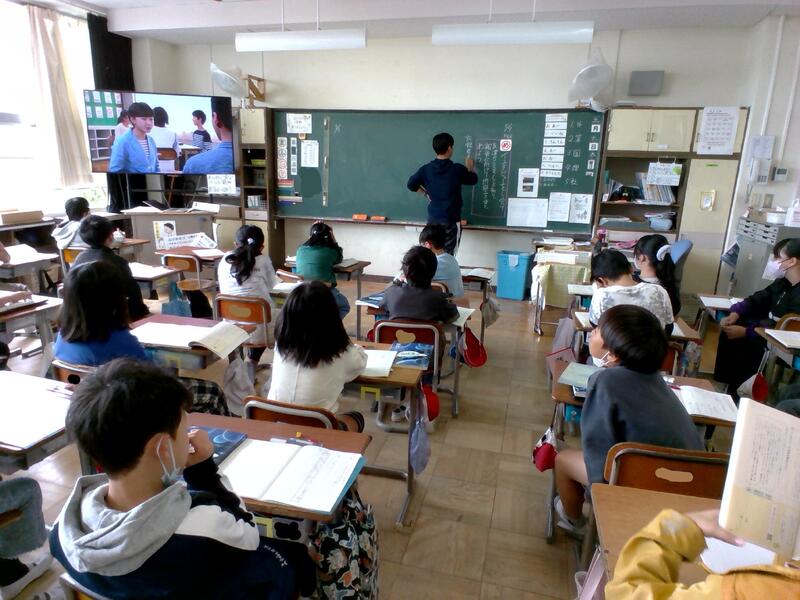 3組国語科「きいて、きいて、きいてみよう」です。授業の始めに新出漢字の確認をしています。テレビに提示された新出漢字をみんなで読んでいます。日々の繰り返しにより、漢字の定着を図っています。