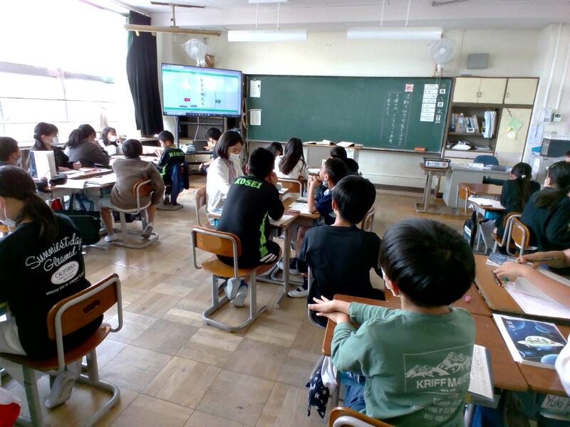 2組国語科「きいて、きいて、きいてみよう」です。話し手の目的や自分が聞こうとする意図に応じて、話の内容を捉え、話し手の考えと比較しながら、自分の考えをまとめます。インタビューの例を映像で見て、どんな聞き方をすればよいか考えています。