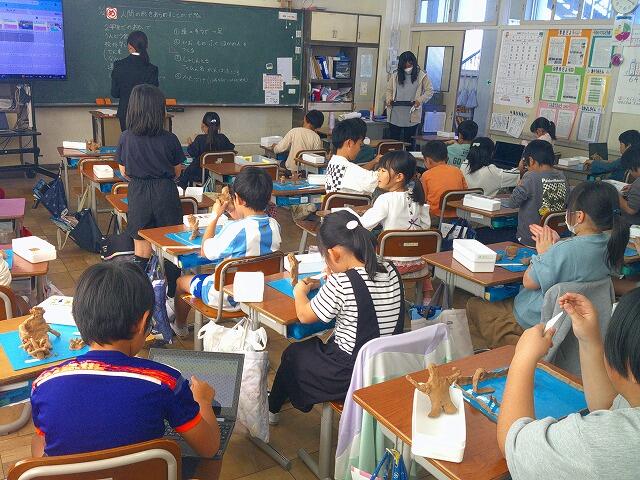 図工の授業です。粘土を使って、今までの思い出の場面を作っています。