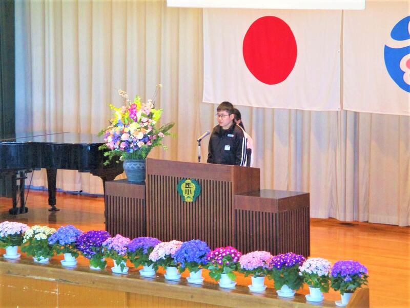 式の最後に、在校生を代表して、6年生の2人から、1年生を迎えることばがありました。今日から「すべての子どもが輝く学校」の仲間です、という、あたたかい言葉でした。
