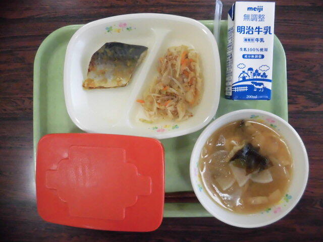 さばなどの青魚のあぶらは、血管に悪いあぶらがたまらないようにして、血液の流れをよくする働きがあります。今日は、カレーマヨネーズのたれに漬けたさばを焼きました。よくかんでいただきましょう。