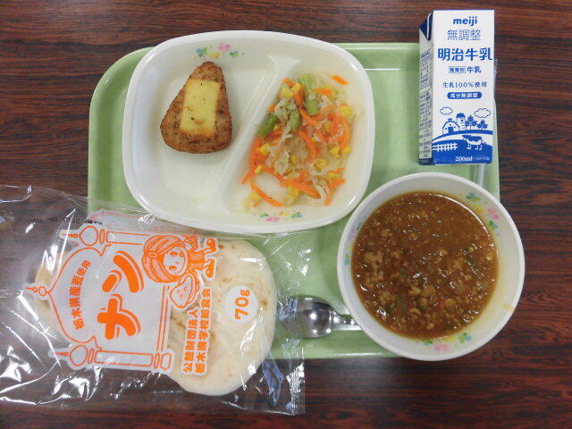 今日の献立は2、3年生に「好きな給食は何ですか?」と聞いた時に、「ナン」と答える人が多かったので「ナン」を使ったメニューにしました。