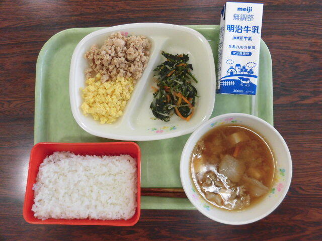 とりそぼろの茶色、いり卵の黄色、ごまあえの緑色を合わせて三色なので「三色丼」と名付けられました。