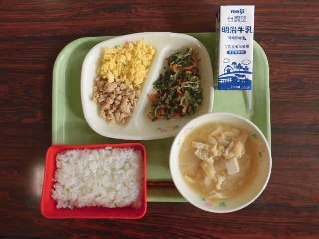 (ごはん とりそぼろ いりたまご ごまあえ)
