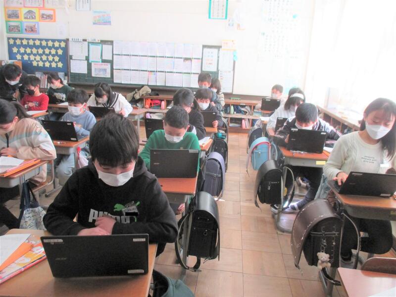 eライブラリで学年のまとめの学習をしています。これまで、eライブラリを活用し、各教科の復習に取り組んできました。保護者の皆様にもご協力いただき、ありがとうございました。