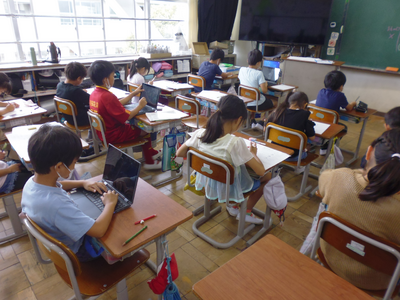 国語の時間では、「修飾語」の学習をしています。主語と述語だけの文に、修飾語を加えて文をくわしくする活動に熱心に取り組んでいました。それぞれに考えた文をタブレットで共有し、さらに理解を深めることができました。