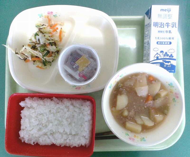 今日は、豚肉や玉ねぎなどと一緒に、肉じゃがにしました。じゃがいもは鹿児島県産のじゃがいもです。70kgのじゃがいもを、調理員さんがひとつずつ芽を取り、手切りをして調理してくれました。