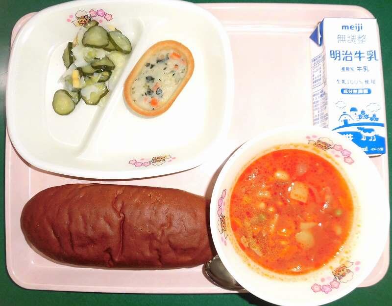 今日の給食は「ポークビーンズ」です。豚肉と豆がたくさん入ったトマト味の煮込み料理で、アメリカの代表的な家庭料理です。