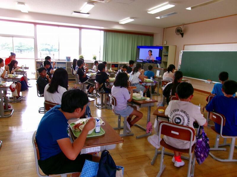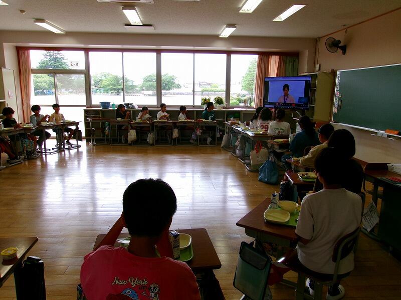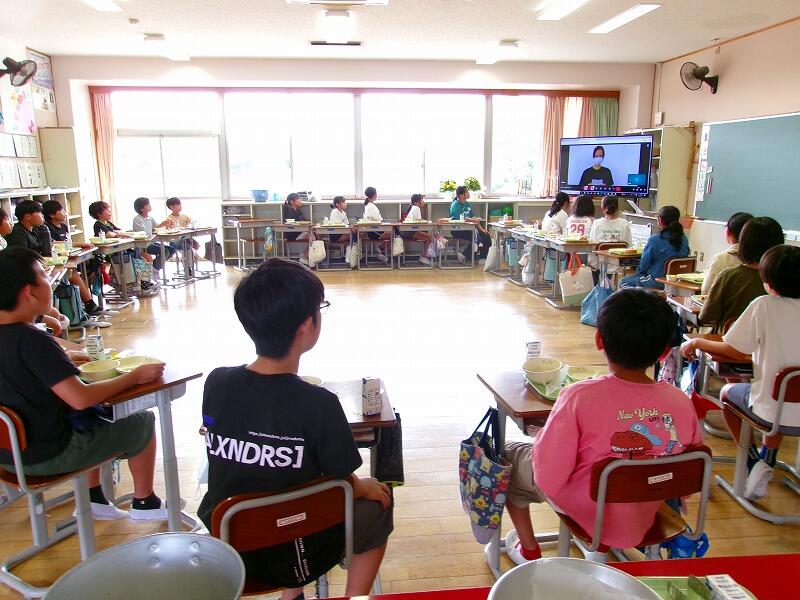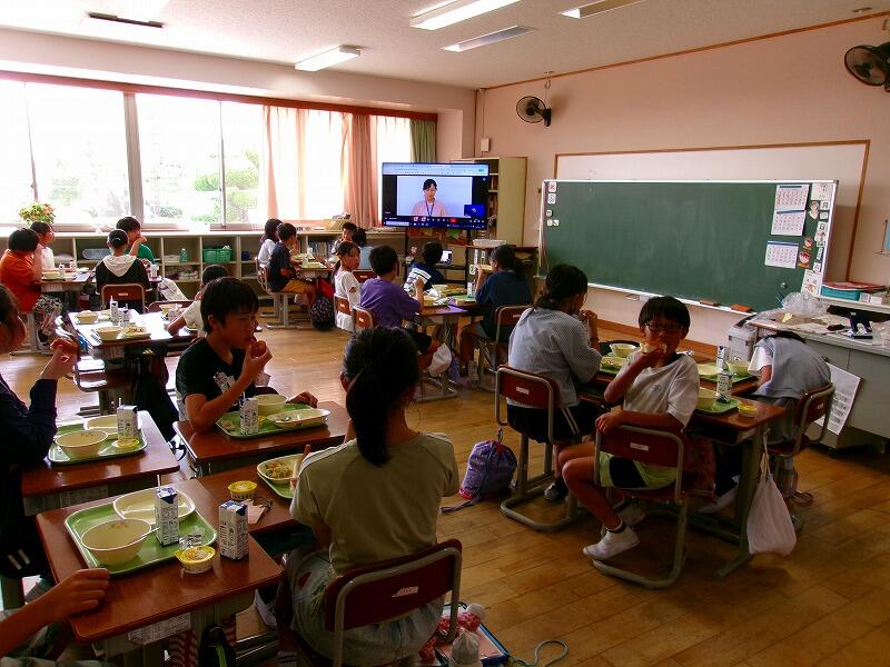 各教室の子どもたちは、最後の自校給食を食べながら、静かにお話を聞いていました。