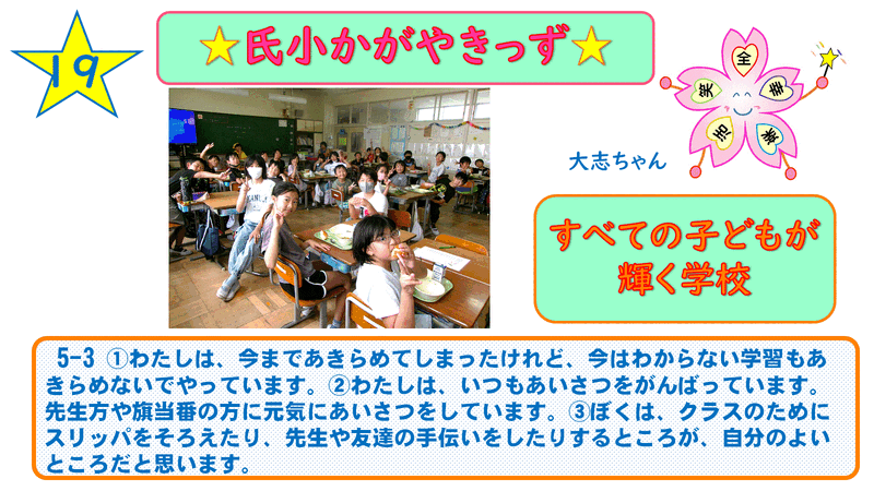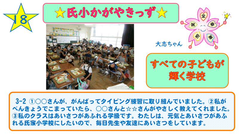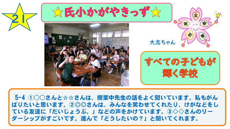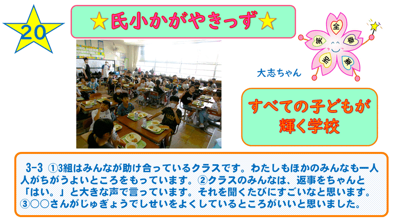 「氏小かがやきっず」は、すべての学級すべての児童が対象で、ローテーションで実践しています。私たちは、自分を肯定できる児童、互いに認め合って生きる児童を育てたいと考えています。第1回目は全校生で実施しました。カードは、各学年の廊下に掲示しています。ここに掲載されているのは一部で、校内放送でも紹介されました。