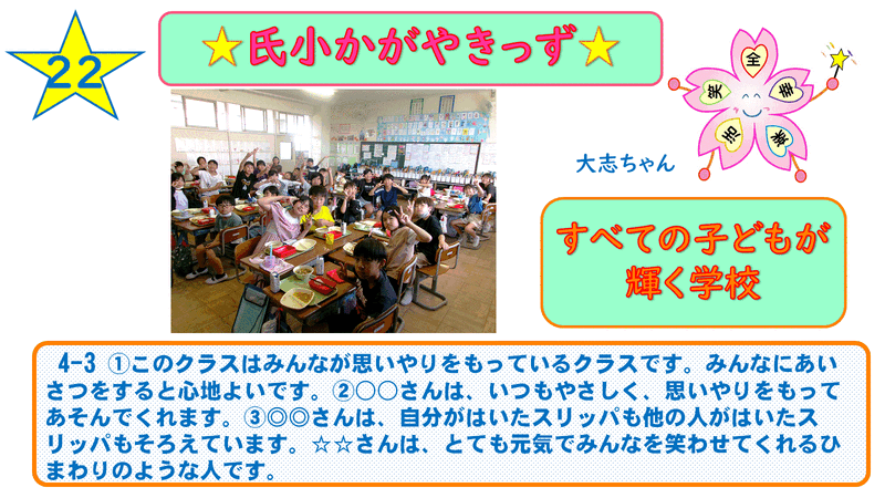 「氏小かがやきっず」は、すべての学級すべての児童が対象で、ローテーションで実践しています。私たちは、自分を肯定できる児童、互いに認め合って生きる児童を育てたいと考えています。第1回目は全校生で実施しました。カードは、各学年の廊下に掲示しています。ここに掲載されているのは一部で、校内放送でも紹介されました。