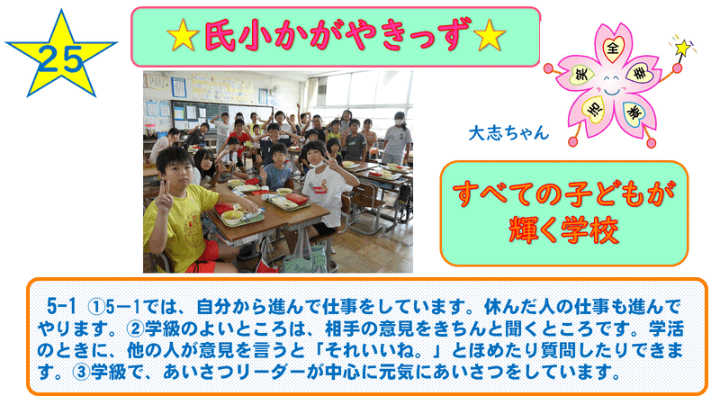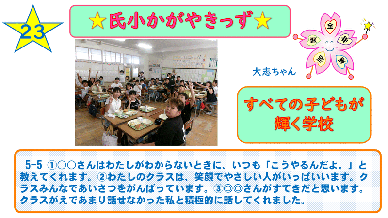 「氏小かがやきっず」は、すべての学級すべての児童を対象にローテーションで実践しています。私たちは、自分を肯定できる児童、互いに認め合って生きる児童を育てたいと考えています。児童のコメントは校内放送で紹介され、各学年の廊下にも掲示しています。