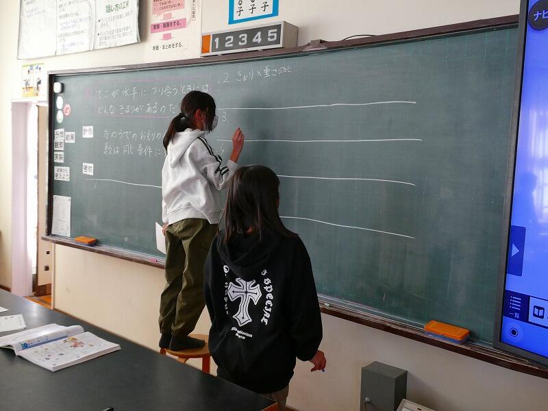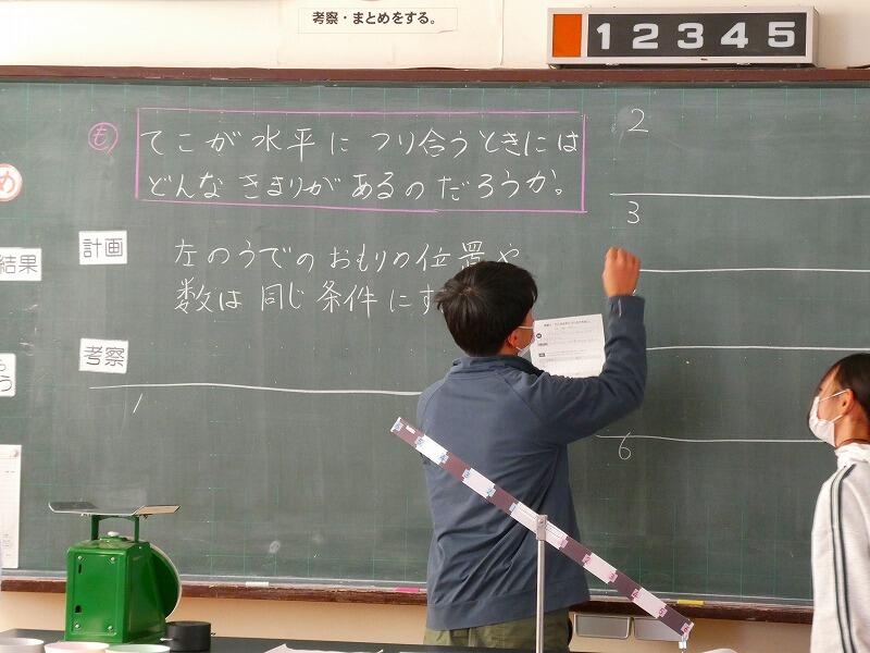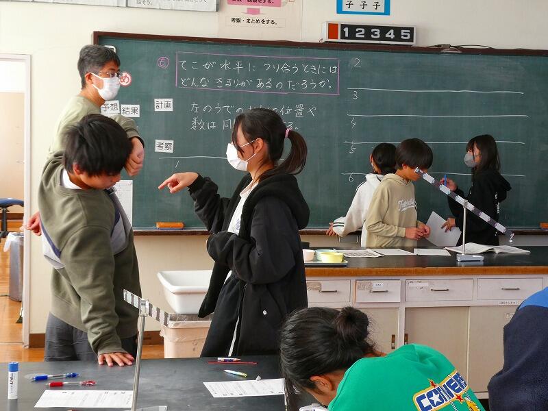 理科の「てんびんとてこ」の授業です。てんびんの釣り合いの実験をしています。