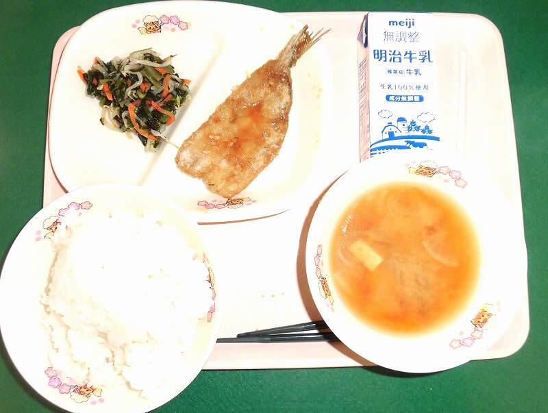 かば焼きというのは、魚を開いて焼いたものにタレをつけた料理です。給食では、いわしに粉をつけて油で揚げてからタレをかけたので、ジューシーな食感になるとともにタレが魚の身によくしみ込んで一層美味しく仕上がっています。ごはんと一緒にしっかりよくかんで食べてください。