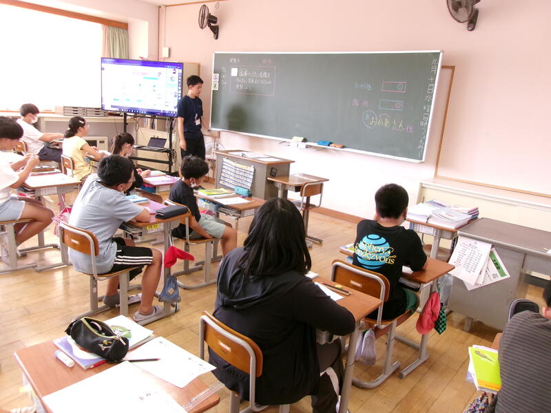 外国語の授業の様子です。夏休みの思い出を紹介し合う活動で、夏休みにしたことを英語を使ってタブレットのカードにまとめていました。