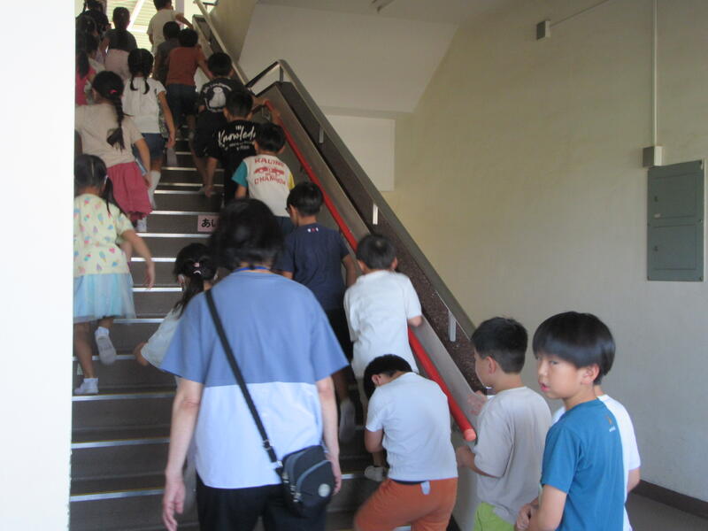 河川の氾濫の恐れがあり、市より避難指示が発令されたことを想定して、避難訓練を実施しました。校舎1階に教室がある1年生と6年生は、2階以上の特別教室に緊急避難を行いました。