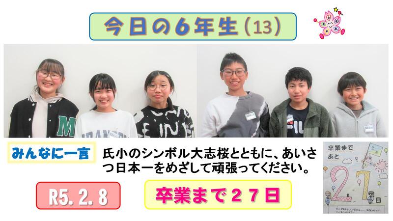 今日の6年生です。全員が「中学校では勉強を頑張りたい」と話していました。「ボランティアもしたい」という児童もいて、感心しました。