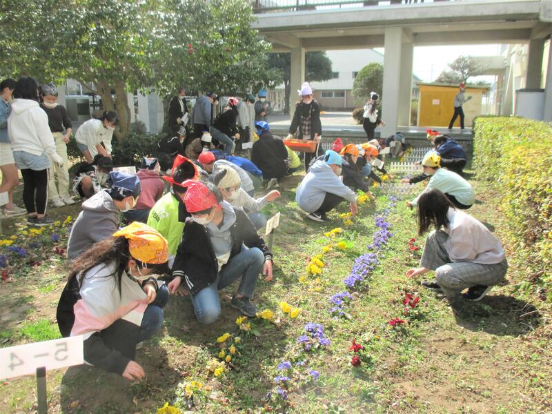 昼休み、児童のボランティアメンバーであるSUNさんサポート隊Jrが、中庭の除草活動を行いました。学年を越えて協力し合い、花壇をきれいにしました。