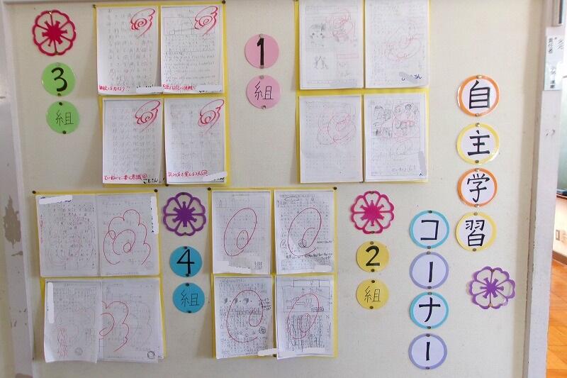5年生の自主学習コーナーです。一生懸命取り組んだ子のノートのコピーが、お手本として掲示されています。