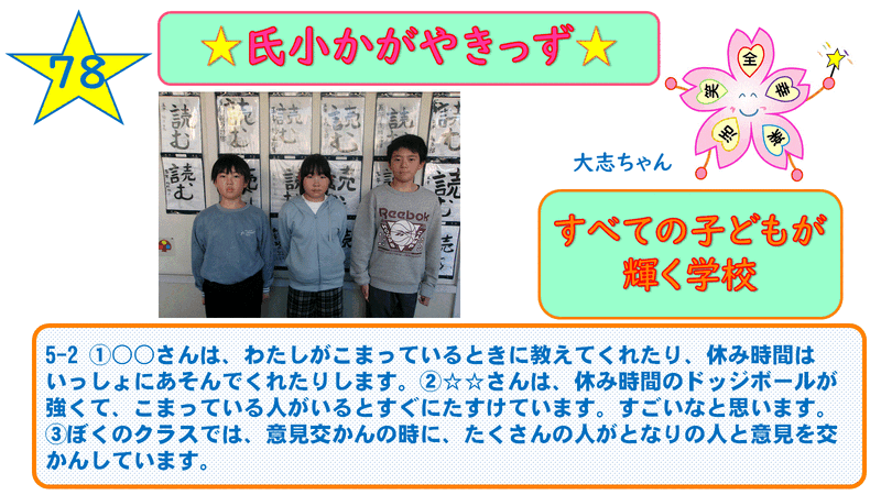 「氏小かがやきっず」は、すべての学級すべての児童を対象にローテーションで実践しています。私たちは、自分を肯定できる児童、互いに認め合って生きる児童を育てたいと考えています。児童のコメントは校内放送で紹介され、各学年の廊下にも掲示しています。