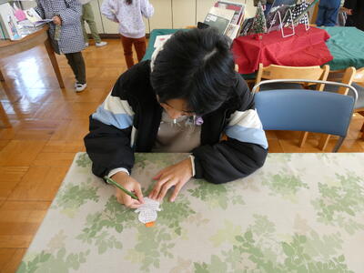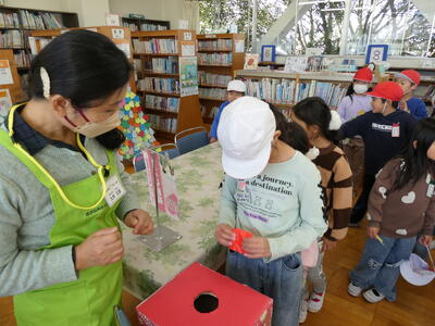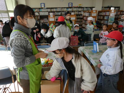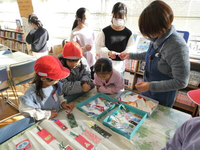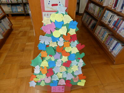 本日の昼休みに、図書ボランティアの方々が中心となって、図書イベントを開催しました。クリスマスツリーにお気に入りの本や好きな本を書いて貼り付けると、くじを引けるというものです。くじを引くと、しおりや読書券などが当たり、子どもたちは大喜びでした。図書室には長い行列ができて、昼休みが終わる頃には素敵なクリスマスツリーが完成しました。