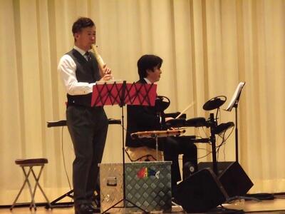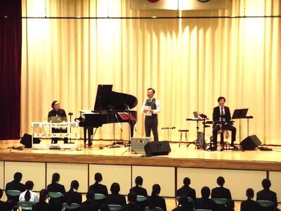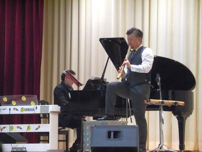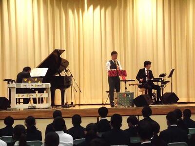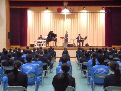 本日の4校時に、さくら市教育委員会主催の芸術鑑賞教室を実施しました。宇都宮短期大学音楽科講師によるプログレッシブロックバンド「IWASHIYA」による尺八・ピアノ・ドラムによるコンサートでした。とても素敵な演奏ありがとうございました。