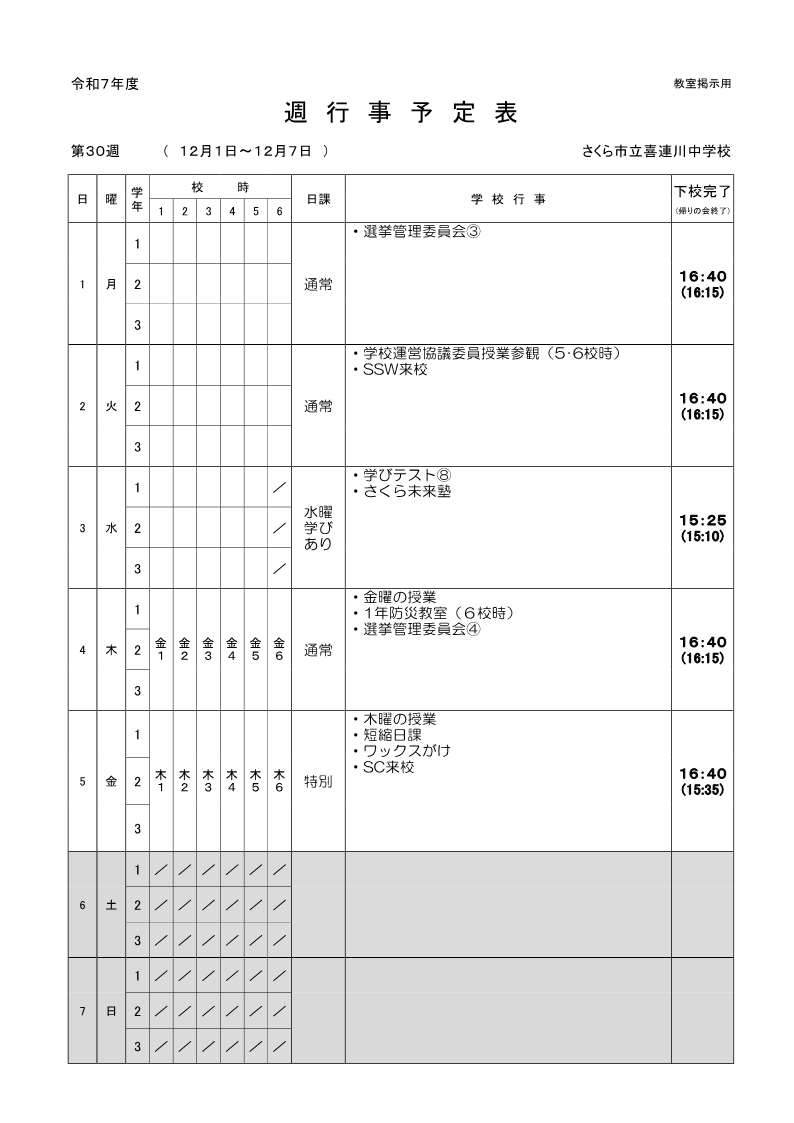 12月1日~7日の週行事予定