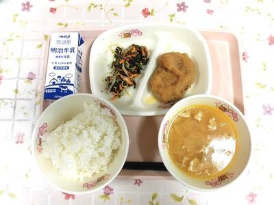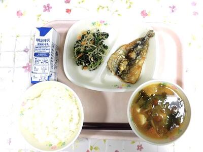 【献立】ごはん、牛乳、アジフライ(ソース)、茎わかめの五目きんぴら、とうふとわかめのみそ汁