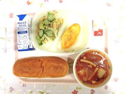 【献立】ミルクパン、牛乳、ミートオムレツ、コーンサラダ、ミネストローネ、ジャム&マーガリン