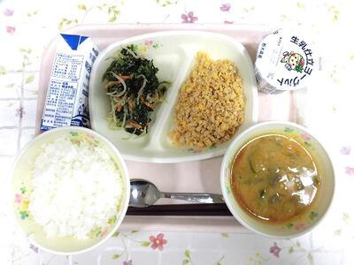 【献立】2色ごはん(ごはん・たまご入りとりそぼろ・ごまあえ)、牛乳、キムチとん汁、ゼリー