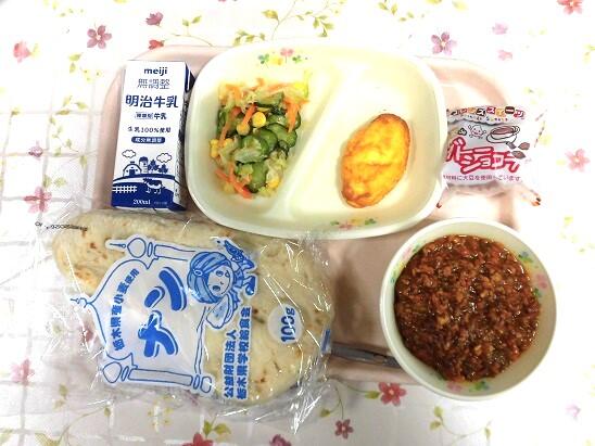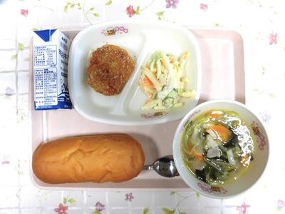 【献立】黒糖パン、牛乳、ハンバーグとまとソースかけ、ポテトサラダ、ABCスープ