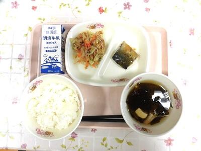 【献立】ごはん、牛乳、サバの塩焼き、ひじきのいため煮、豚汁